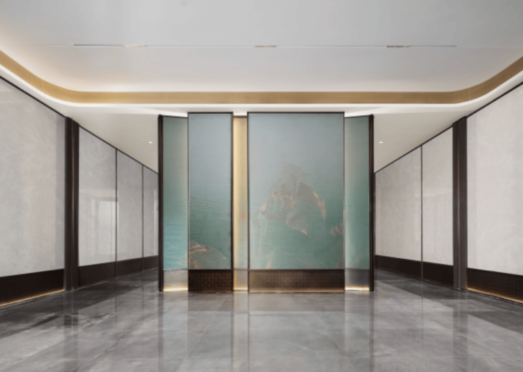 公区处处透露着审美的高级感、生活的松弛感。尤其是"霁"与"金"的手法运用,入户大堂地面满铺石材,主景墙面使用了汝窑天青色+金色定制纹样的艺术玻璃,在大堂墙面装饰、会所空间的背景、沙发摆件等多处运用天青色,与金色的线条进行搭配使得空间审美品位高雅非凡。