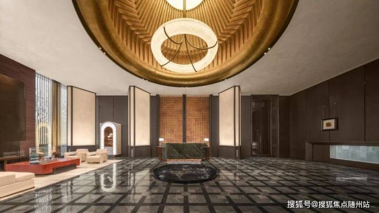 归家大堂的穹顶承袭了皇家宫殿藻井形制,采用非遗“泥金彩漆”工艺,手工逐寸贴金,金辉流转,如星河垂落。中央圆环吊灯取意“礼玉”,寓意天圆地方,“敬天礼地之思”凝练于此。地面则采用了香格里拉、普鲁士澜、莱卡灰三种奢石水刀拼花而成。