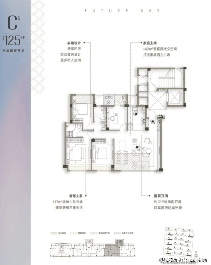 建面约125㎡户型:四房两厅两卫:南北通透,类“一户一梯”设计,增强了归属感与私密性,入户空间可安置童车、鞋柜等。该户型是小面积真边套四房,卧室面宽尺度优越,四开间朝南,约12.9米南向面宽,南向大横厅开间约6.4米,餐客厅面积约40㎡。