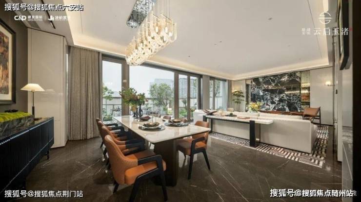 以建面约290㎡排屋样板房为例,玄关处黑白拼花地面,构成几何秩序的序厅深色皮革墙面与古铜金属勾勒出沉稳质感;玉琮纹样、良渚图腾等文化符号,被巧妙转译为现代装饰细节。整个空间在“海派风情”“东方意境”之间取得精妙平衡,不张扬,却见格调。