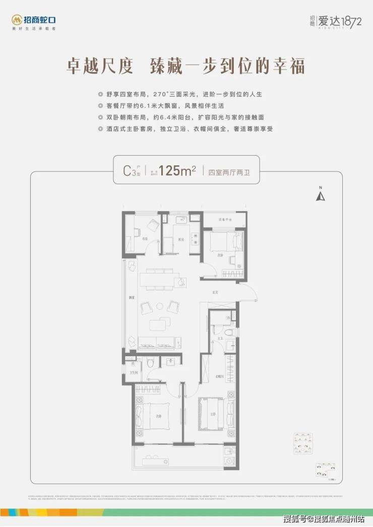 在户型上,其中建面约106㎡户型完美契合年轻人的置业需求,无论是LDKB一体化设计、正三房+双卫的格局,还是约3.5南向大开间、“1+X”创变空间的尺度,都做到了改善级空间感;而建面约125㎡大四房户型则以270°三面采光、奢阔客餐厅、双卧朝南等创新布局,为置业者实现一步到位的生活。