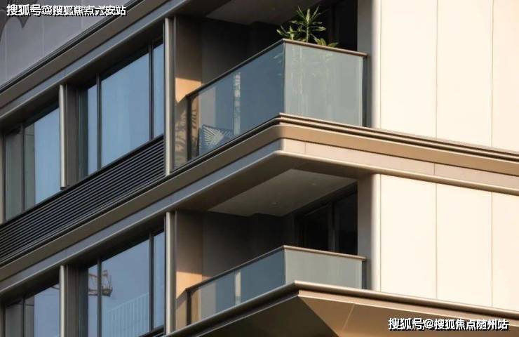 高层立面用上了大面积铝板与玻璃相结合,配合斜切工艺和“油画框”式设计,提升采光与景观视野。香槟金色铝板搭配斜切工艺,阳光下建筑通体镀上一层暖金色,金属铝线修饰的窗景宛如嵌在“金色画框”中。