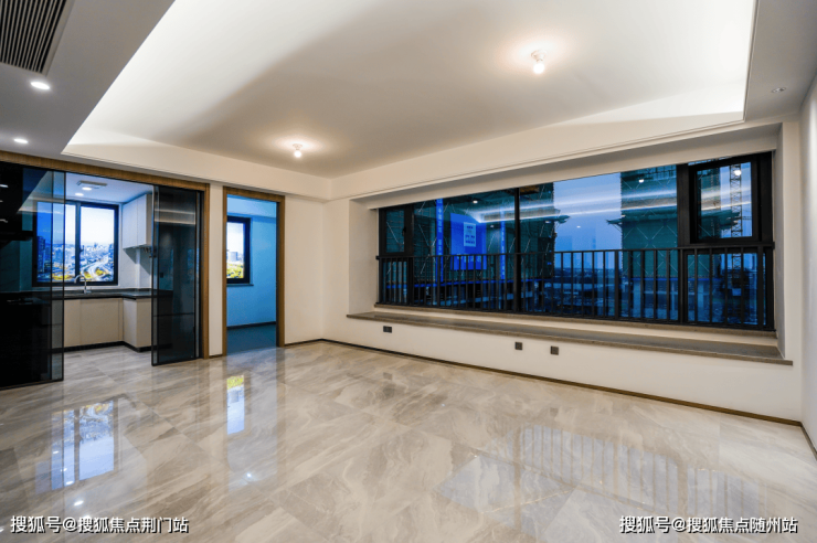 入户后有独立玄关,隐私性较好,紧接着映入眼帘的是带长飘窗的大公区: