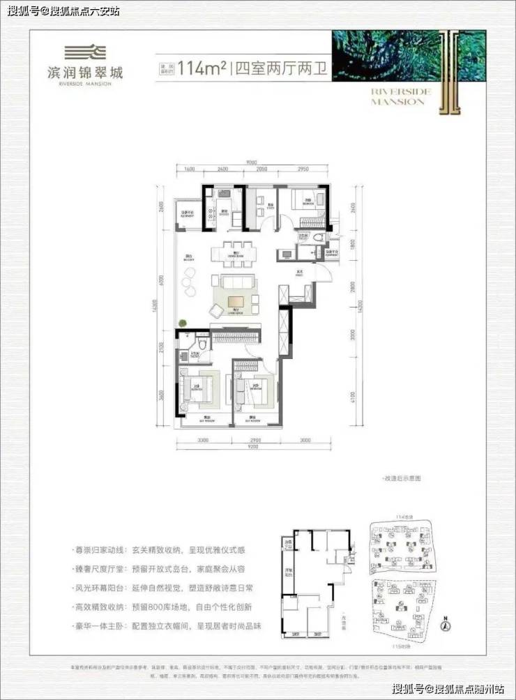 改善边套户型:建面约114方四房两卫,拥有独立入户玄关、客餐厅+封包阳台、南向主卧套房+次卧……4房功能一步到位。