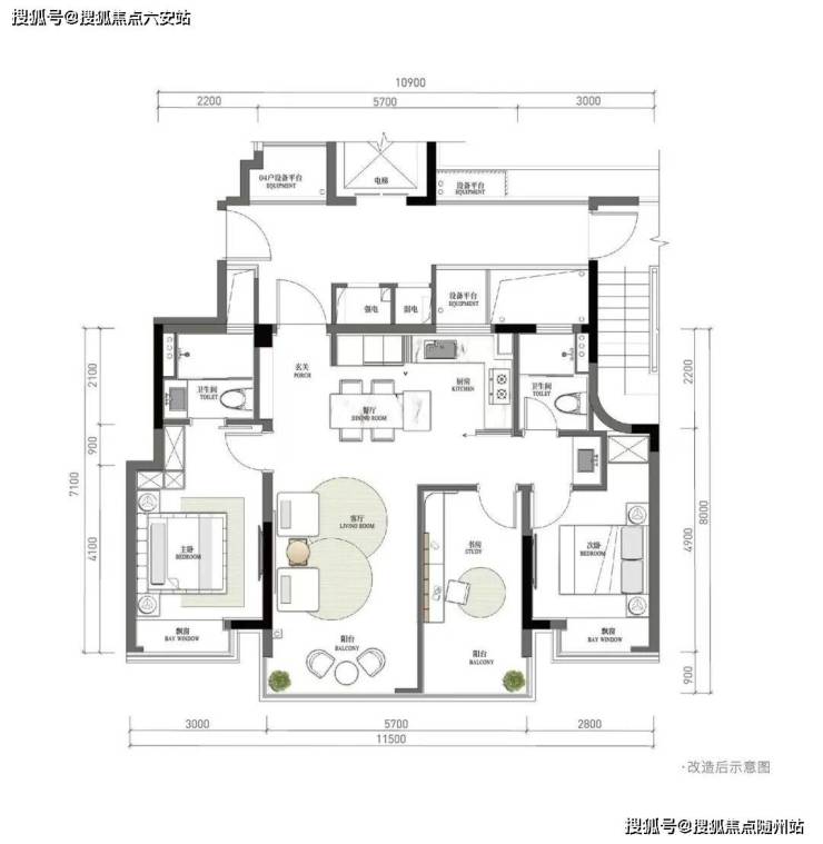 当然,预算更高的可以看看——刚改旗舰边套户型:建面约114方四房两卫。