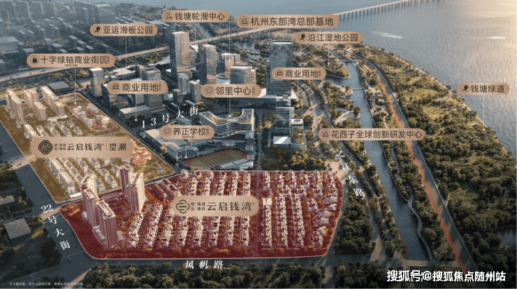 建发·云启钱湾·望潮位于杭州钱塘区东部湾新城的核心区域——金沙嘴,是钱塘江城区内的最后一湾,也是东部湾新城三大核心组团之一,片区定位为总部经济为基础的都市CBD,未来将形成企业总部、住宅、商业、公园等超级业态群,是钱塘区重点发展的标志性区域。