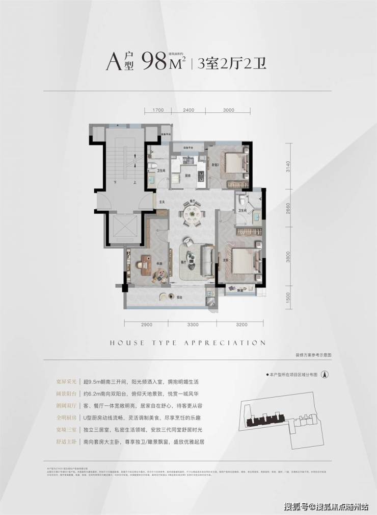 高得房率(加粗):88㎡户型实际得房率超85%,空间零浪费,三开间朝南+双阳台(观景+实用),客餐厅一体化+U型厨房,卧室均带飘窗,小面积也有大体验;