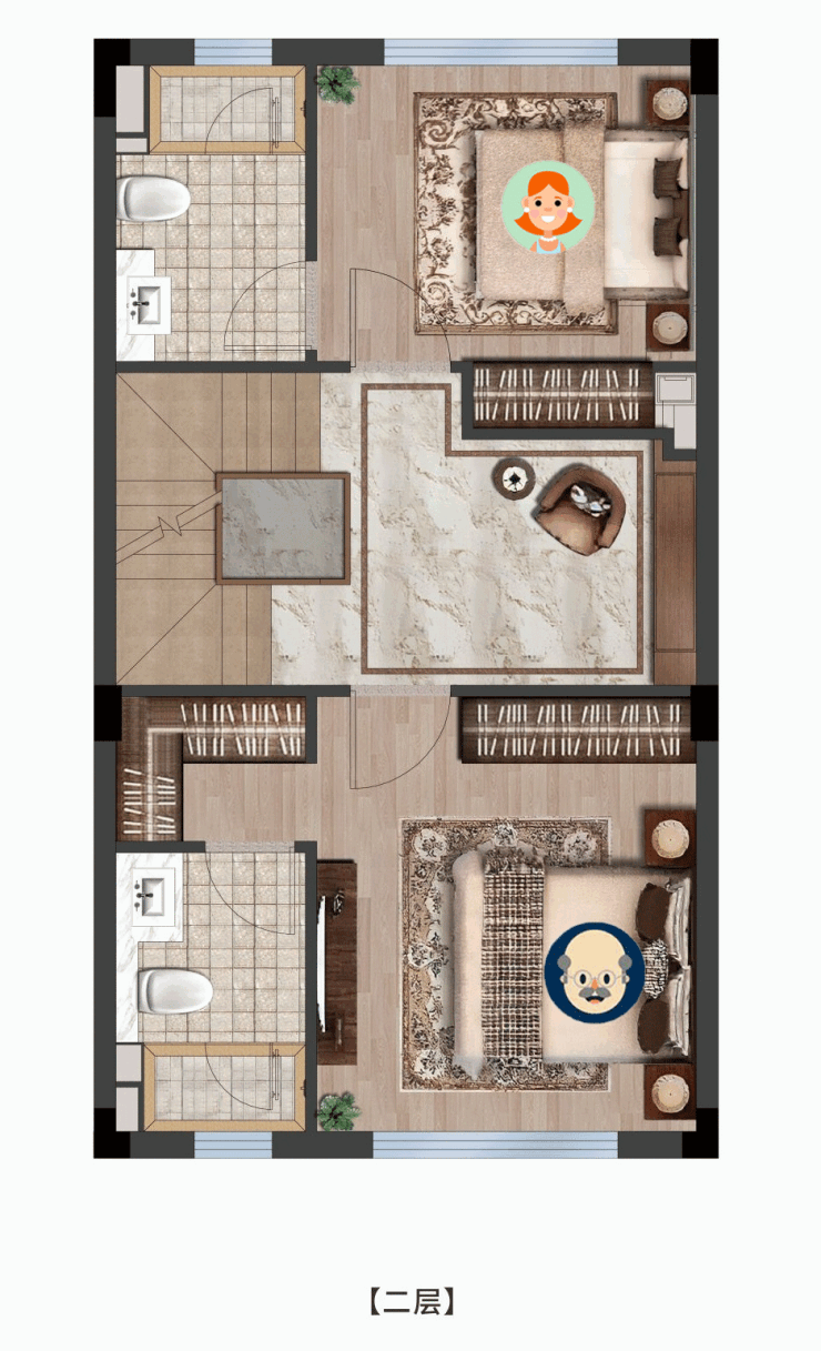 二层双套房设计,真正做到有序布局,南北分立匹配独立卫浴。全明通透,每一个房间,都能充分享受阳光的宠爱。这一方随心所欲的小天地,足够承载私密生活的尺度,同时也予以每位家庭成员阳光的温暖和鲜氧的滋润。