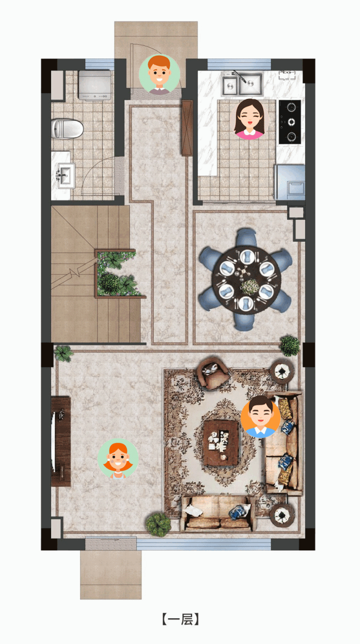 本户型由地面3层与地下1层构成,上下合而不扰,一楼同享家庭欢笑,回房是怡然随心天地。一层南北通透,餐客厅一体化设计,餐厅、客厅、厨房界限模糊,家庭成员融洽共处,在厨房烹饪也不再是“独角戏”,而是全家人的协作与欢笑。