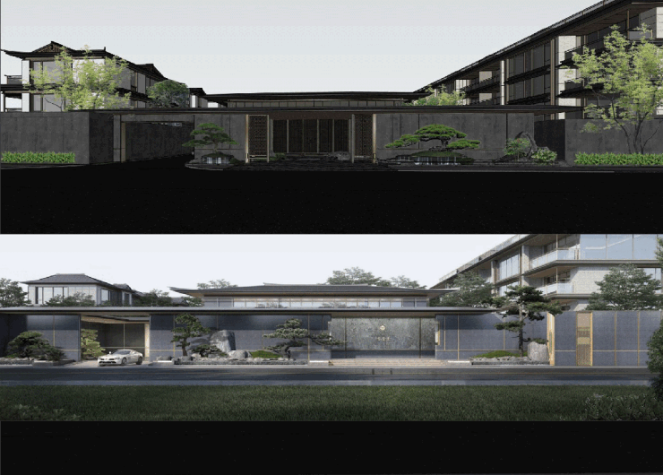 春颂香雪里主入口旨在营造隐逸雅奢的宋风门府。在有限的用地条件下,团队采用非对称式门头布局方案,通过迂回的行进路线营造曲迤婉转的空间体验,既弱化了空间秩序,又通过延迟抵达和感官积累创造了心理上的仪式感,回应了都市高端项目对“低调奢华”空间场域感的诉求。