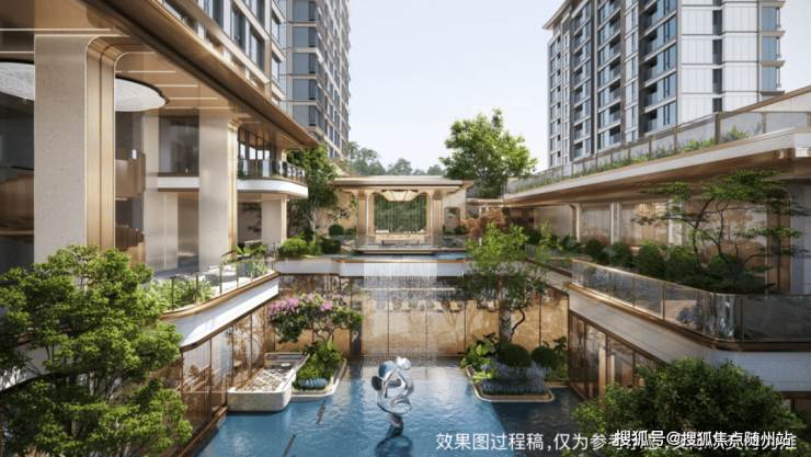 中央水景四周布置廊庭、观景平台和亲水卡座等,搭配精心挑选的桂花、冬青和杜鹃等昂贵植株,每一棵的树龄都超百年。