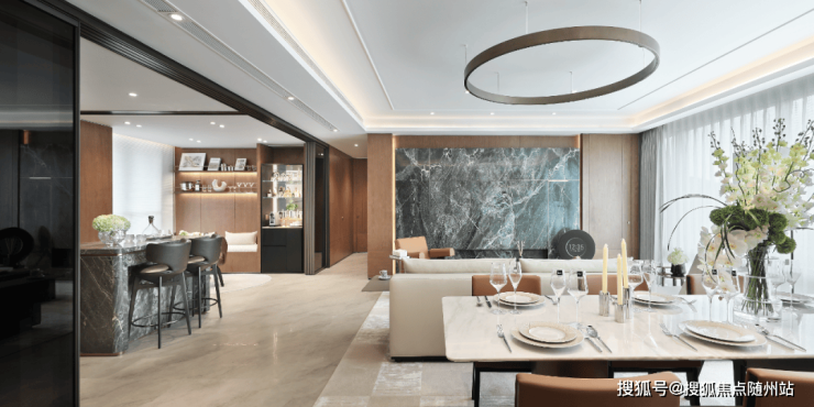 社区主入口是超宽幅门头,宽约 80m 高约 7.1m,两侧的维多利亚绿奢石以及中央的白雪公主透光石很吸睛,浅色的部分则是贝金米黄石材,圆弧的工艺处理也更显温润及价值感,中央栽植的超大紫薇树拥有约60年树龄,底部则是采用宝格丽黑奢石作为基座