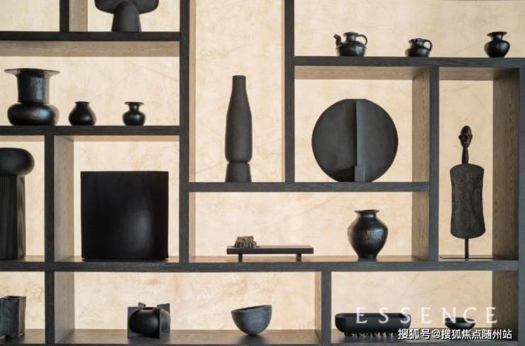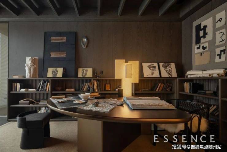 与约560方展示区不同的是,兆丰ESSENCE这套由春山秋水设计的约730方“归屿”概念展示区,通过精心摆放的艺术品、做旧纹理的木饰面、多元且复杂的吊顶设计等在风格上缔造截然不同的艺术风格。