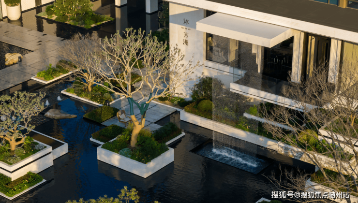 走近沐芳洲,首先迎接您的不是冰冷的大门,而是一座长卷般的艺术前场。设计师在这里奢侈地造了一个宽约150米、纵深约36米的超级水院。奢石、叠水、层层绿植与雕塑高低错落,最特别的是,一道叠瀑直接从建筑立面上倾泻而下,仿佛建筑在与自然对话。