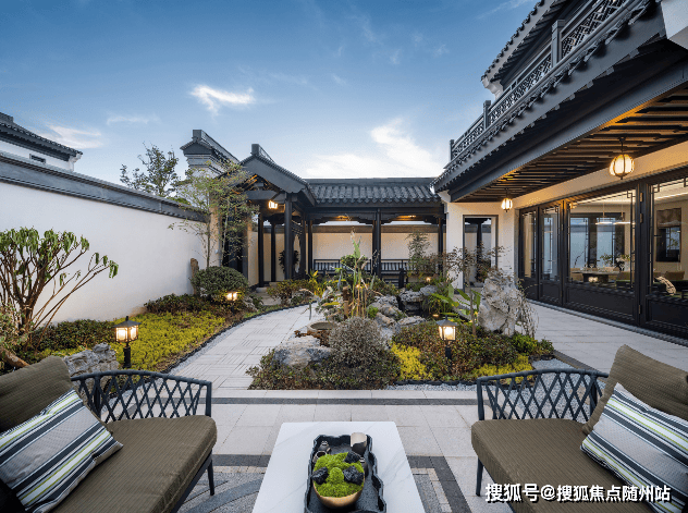 园林规划:以“堂、巷、院、宅”四重归家礼序,打造宋式园林,搭配亭台、曲径、叠水、湖石、全冠移植绿植,门口移栽价值50万的苍虬黑松,步移景异,尽显东方雅致[4]。
