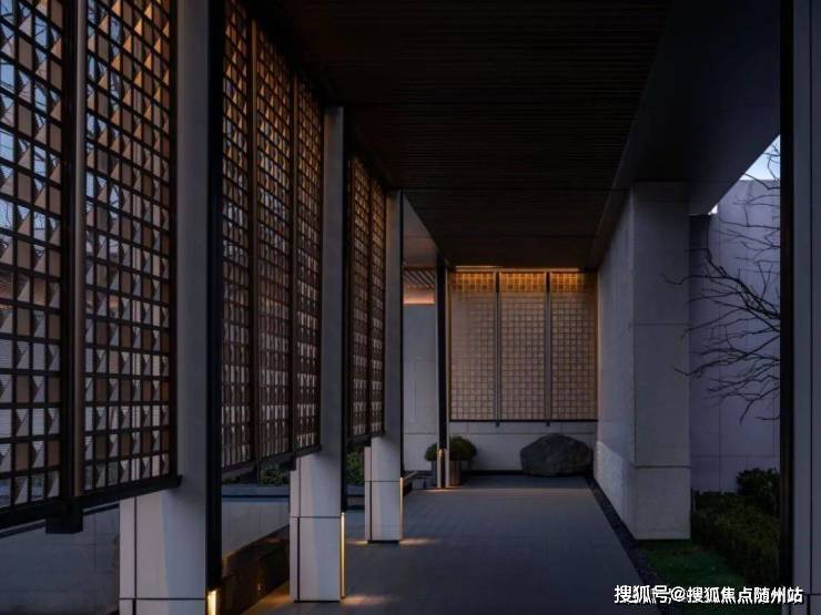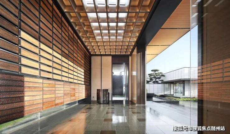 门堂『云栖门』,宽度超60米,顶部采用单檐平屋顶,简约利落;入口处的金属格栅屏风,以及堂内由山石、叠水、植被组成的景墙,让半隐半露中展现东方的审美情趣。