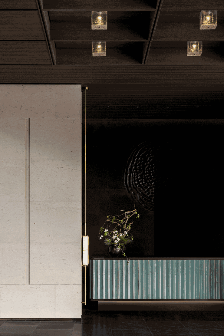 厅堂『掬月厅』,以玉璧为灵感演化回字纹、屏风廓壁造型,手工锤纹古铜、雀眼木、蓝翡翠等高阶用材,将精致刻画入魂。