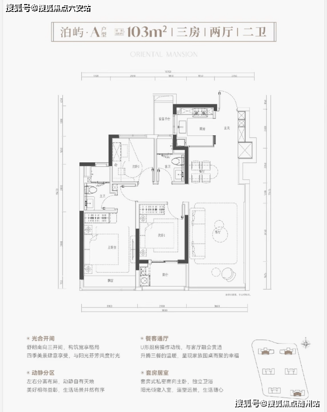 建面约103平米户型,三房两厅两卫,空间布局合理,功能齐全。南向三开间设计,朝南次卧配备阳台,客厅与阳台相连,空间更显宽敞明亮; U型厨房采用半开放式设计,玄关巧妙融入S墙冰箱位,空间利用率高,采光更佳;新规户型得房率高达约90%以上,实用性强。