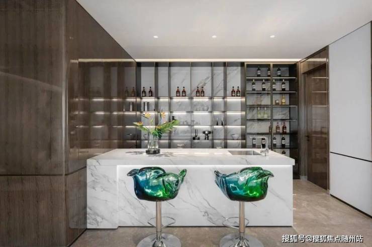 同样的石材纹理也出现在这里的西餐岛台上。如果说80方的会客厅缺点什么,那么岛台的设计则解锁了会客社交的更多情景。