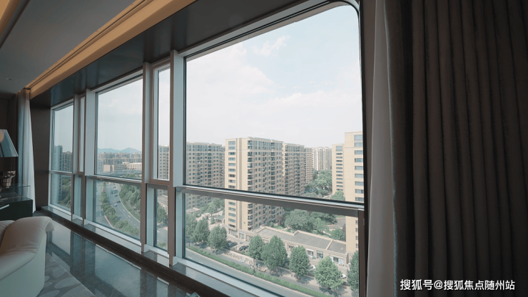 穿过玄关,就是约80方的巨型会客厅,约3.55米的层高带来更宽广的空间,会客厅东面采用了超大落地窗设计,可以将城市的风景引入室内,加上双层中空LOW-E玻璃的配置,又将城市的喧嚣之声隔绝在外。