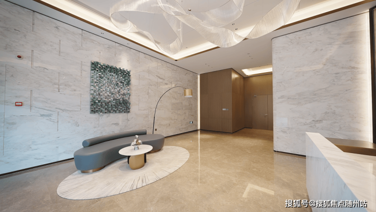 层高约5米的精装入户大堂,整个鱼肚白的大理石墙面,配上意大利灰大理石地面,局部用灰色橡木过度,转角处巧妙的运用夹丝玻璃,沉稳、内敛、精致。丝带造型的主灯带来整体柔和的光线,营造一种轻松温馨的氛围,其实回家的感觉就是寻得一份内心的宁静。