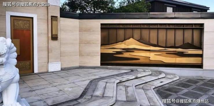 最显眼的是主入口宽20米、高8米大门,取自京城国宅门户制式。大门的选材非常考究,整体以黄色木纹洞石、汉白玉、黄铜这些昂贵材料为主,凸显了门头的磅礴气势。大门两侧影壁墙是以王希孟《千里江山图》为蓝本,打造了一幅山水江山画。
