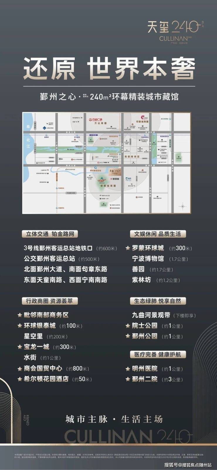 天玺240坐落于鄞州南部核心繁华原点,占据着城市的核心资源配套。环球银泰城、罗蒙环球乐园、地铁3号线、九曲河景观带下楼即享,星空里、水街、宝龙一城(在建)多个商业中心环伺左右,近邻鄞州最大两个生态公园鄞州公园、院士公园,毗邻宁波“曼哈顿”南部商务区,加上完善的学区,医疗、商业、文娱、景观、金融资源应有尽有,居住生活的便利性在这里一览无余,