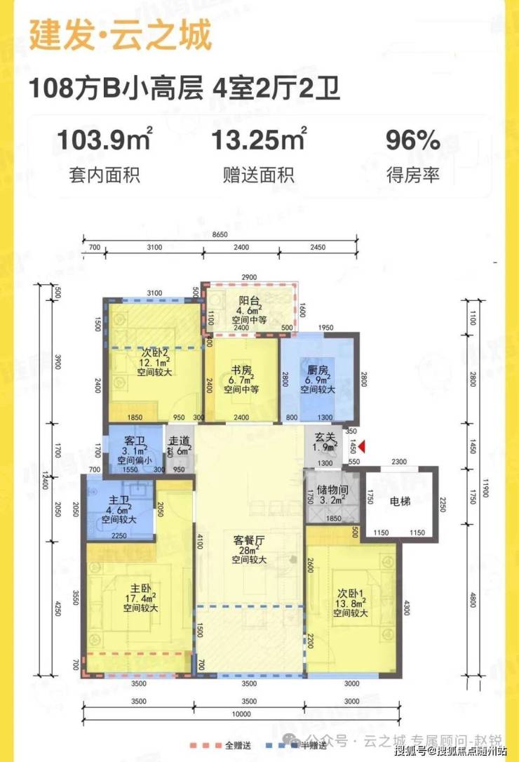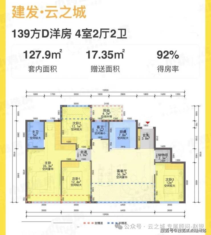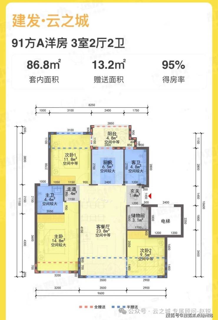 云之城做了封闭阳台,得房率最高能达到96%。全T2分布户型,放眼整个市场,这样的得房率绝对是名列前茅。