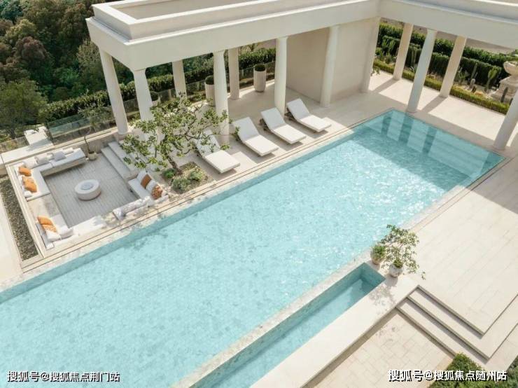 比如,你能看到入口那片很美的镜面水池,被法式廊柱包围出强大气场;你也能看到地下约8.2米层高的室内恒温泳池,它的上方正闪烁着从镜面水池透射下来的日光;