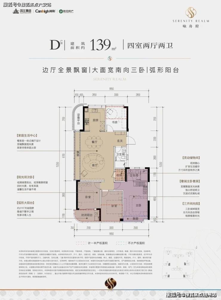 一款是四开间朝南的横厅户型,南向约13.85米的极致采光面,阳台也有约9.8米;动静分区,私密感超强;主卧套房带L型弧形转角飘窗,居住体感堪比全景舱。