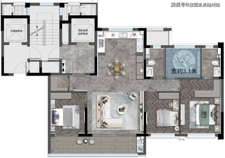 玖樾采用LDKB一体化布局,约5.1米会客厅