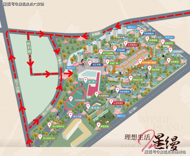 景观树、草坪和流水的有机组合,将自然巧妙纳入主入口围合,带来安宁静谧的感受。东门(建设中)门口打造星际河谷、星邻剧场,是小区次大门,北门(建设中)直通棕榈路,南门(建设中)同样是小区重要入口。