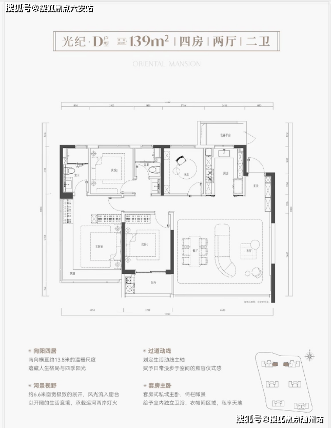 约139平米的户型分为横竖两款,均为边套设计,两梯两户,尊崇感与私密性并存。“横版”户型拥有四开间朝南、大方厅、L型转角飘窗的“全景舱主卧”以及超级双联阳台。