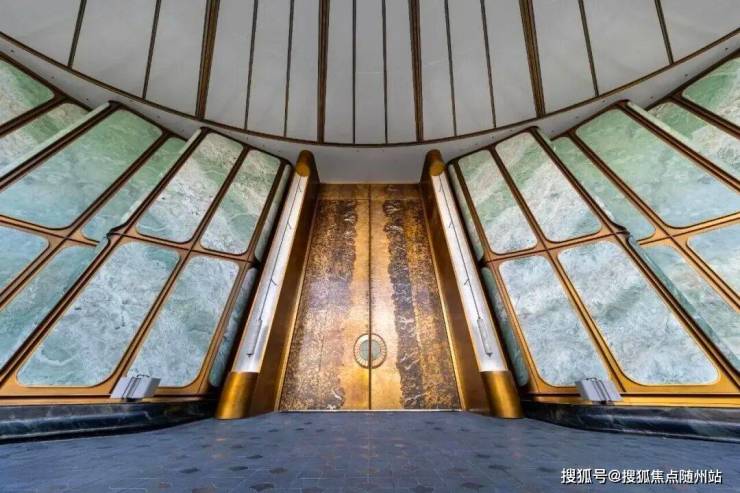 以杭州折扇为灵感而造的超尺度门庭,12片巴西进口百达翡绿玉石屏风,由非遗传承人朱炳仁团队打造的巨幅铜门,“玉镜流光”雕塑,大堂内八根巨幅立柱,还原了扇骨的形态,汝窑冰裂纹的陶片镶嵌,地面拼花运用江南花窗元素……