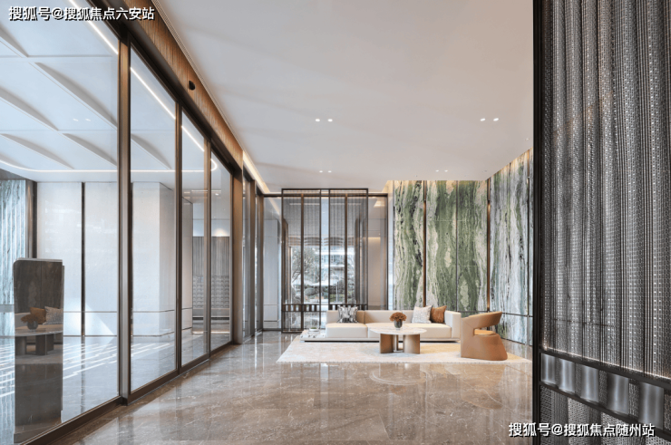 一路走到电梯厅,温德姆灰、维多利亚绿,不同造型的金属格栅和软包“目不暇接”,这种基调的入户大堂,在大平层市场里都没看到几个,很难想象这是一个限价的项目。
