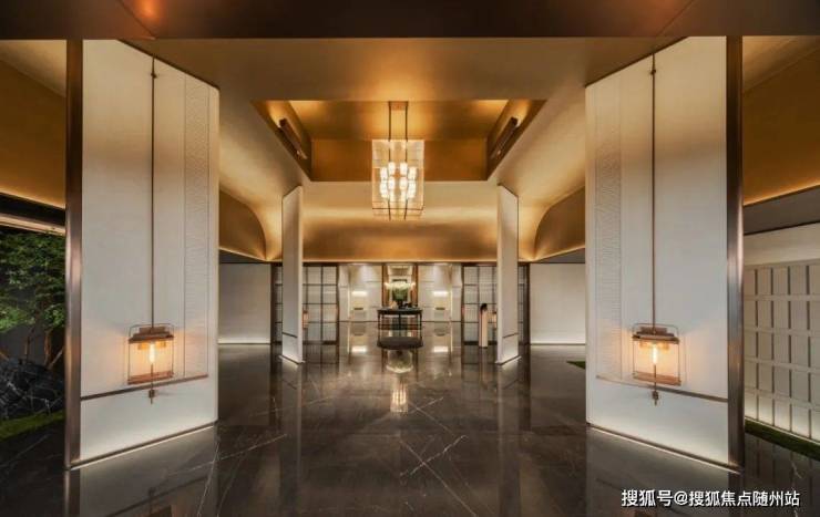大厅前是一个高阔的空中艺廊,层高约4.2米,铺就白色温润玉石,用料奢华。