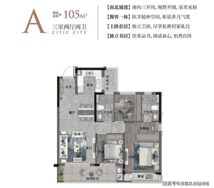 中信城以央企匠心精研产品,革新设计理念,对户型进行了全方位的升级。建面约105㎡的A户型,采用LDKB一体化设计,南向三开间、明朗会客厅、景观双阳台、人性化U型厨房,在优质的空间内,还原设计精粹与时代格调,引领居住空间美学的时代变革。