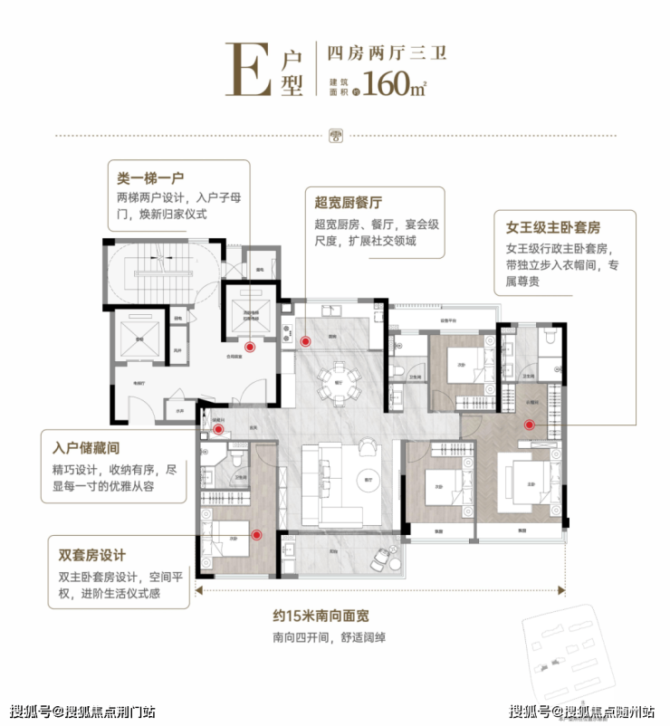 160㎡户型,1T1户设计,高配臻质四房+双套房,星级酒店级体验皆是日常;LDKB一体化设计,南向约15米四开间大面宽,约4.4m面宽餐厨厅,可轻易摆下圆桌+餐边柜组合,奢享宴会级空间,完美诠释了近200㎡的空间享受。