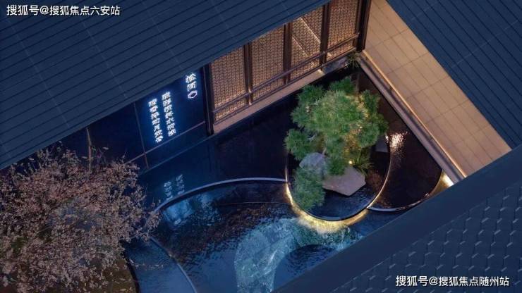 一扇门,门外是喧嚣,门内是静雅。跨过大门,只见梅花树矗立中央,搭配高低错落的黑松树和山石,树下潺潺的水镜,映衬着落梅图案纹理,形成一幅寒梅山涧盛放的山水画卷。