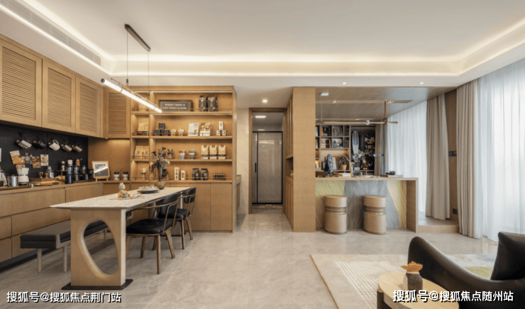 在湖与舍, 每幢均设约4.5米高的架空层。潮流家具点缀, 木饰墙、水磨石凳和金属吧台穿插,就像来到一处高雅的咖啡馆。