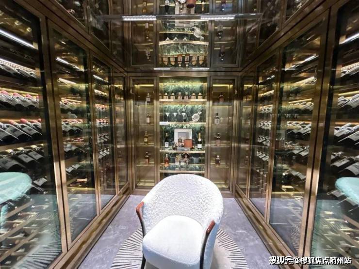 从静心凝神的茶室走几步,就到了藏酒饮酒的开放式会客空间,墙上橱柜码着主人从各处精心搜罗回来的上等佳酿。