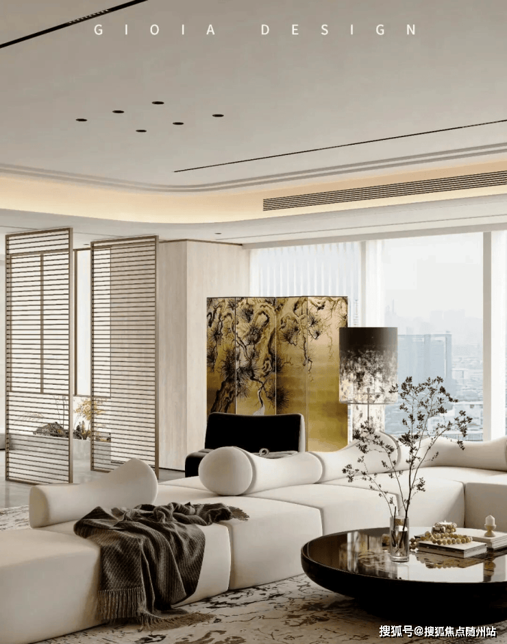整体设计风格以浅白色为主,客厅背景墙贴着大面积「芬迪白大理石」,弧形的造型配合木饰面,以及酒店级的灯光设计,让整个空间看起来奢华又不失温馨。