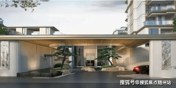 项目以东方宋韵与现代艺术相融合为设计理念,入户门厅采用引园入院的手法,门前水流透过景墙、两侧相迎的黑松以及铜元素入户大门的设计,让归家之路更具尊贵仪式感。