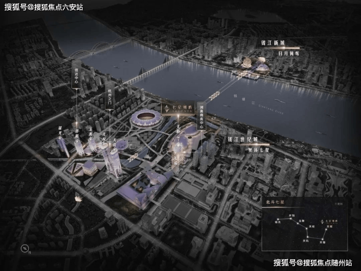 七星潮鸣位于杭州钱江世纪城奥体板块的"北斗七星"建筑群之首的天枢星位,这一位置在杭州城市发展格局中具有战略意义[]。项目与亚运主场馆"大莲花"直线距离不足500米,日均客流超10万人,形成奥体南门户地标效应。