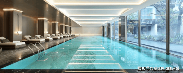 恒温泳池的池底,采用复杂的拼花马赛克工艺,在水面拼装出一朵绽放的浪花;碧玉琉璃般的水色,透过大面积玻璃幕墙与下沉水院的互相映照,漾开自在的微波。