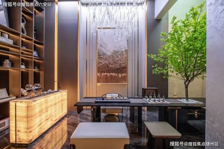 客餐厅采用一体化设计,通过石材、影木、皮革、金属、玻璃等不同材质在光影下的交织,形成张弛有度的现代轻奢多元的场景体验,内敛优雅,充盈着浓郁的都市质感。