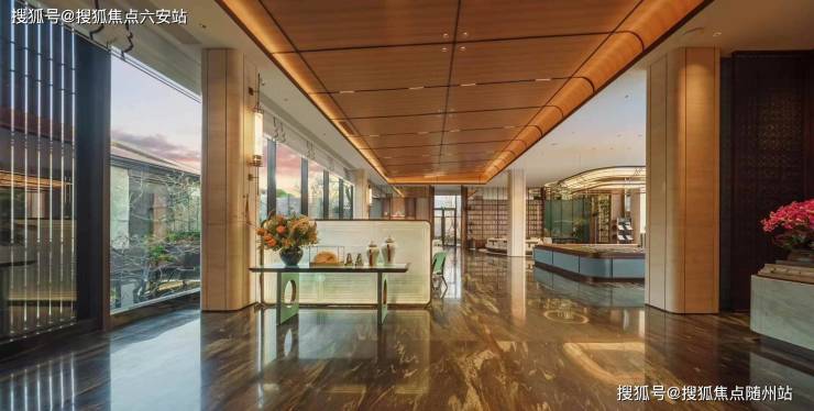 穿过景墙是下沉水院,连着售楼大厅和松林剧场,一边是水瀑潺潺,流淌成一幅古雅的宋韵山水画卷,一边是肆意舒展的罗汉松、老红梅、羽毛枫,铺展出悠远的东方意境。
