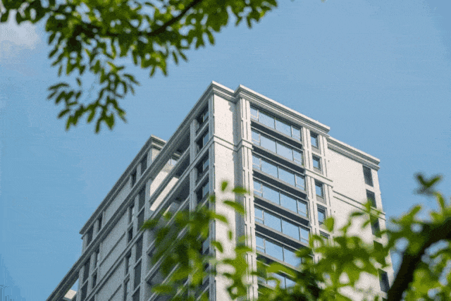 项目樾级立面汲取现代风格精髓,臻选高级灰色调,统一全包阳台+大面积玻璃,形成巨幕光影视觉效果,成为区域天际线的亮眼坐标。