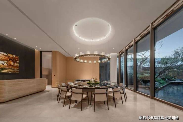 LDKB一体化社交厅:约74.5㎡餐客厅串联8人餐厅、瞰景双联阳台(面宽8.8米),打造家庭交互核心。