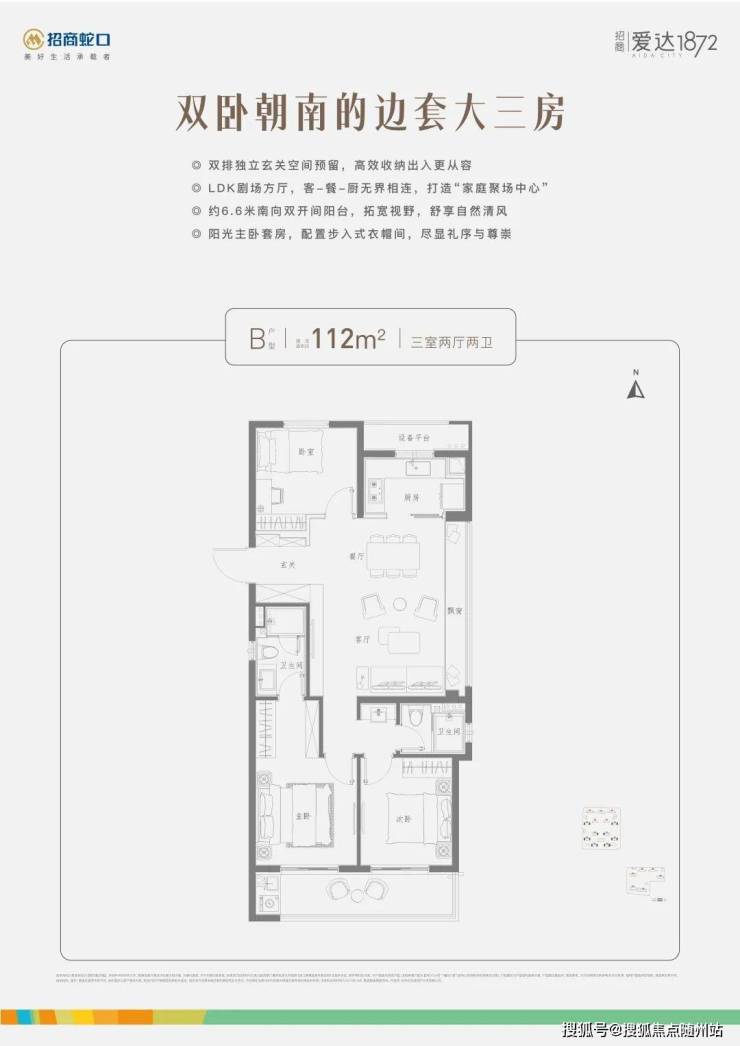 与常见的中间套户型不同,招商爱达1872的约106㎡,南向有3.5开间,面宽约有11.7米。如此一来,可以将更多南向开间面,留给餐客厅,同时外接约5.6米长的南阳台,让公区显得更为阔绰。